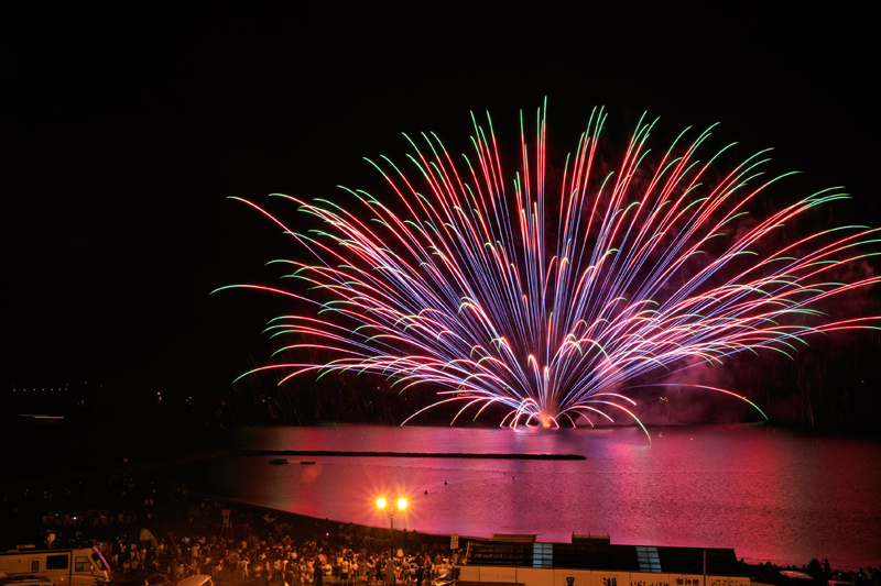 東京湾の入口にある館山湾は、別名「鏡ケ浦」と呼ばれるほど、波が穏やかで、まるで鏡のような海であり、その鏡のような水面に広がる水中花火は海の反射により、絶景となり、水面から響く迫力音は別格です。