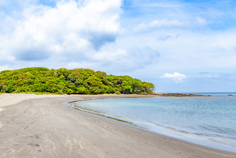 沖ノ島は、館山湾の南側に位置する高さ12.8m、面積約4.6ha周囲約1kmの陸続きの小島(陸繋島)の無人島です。