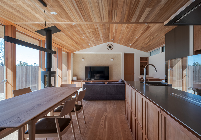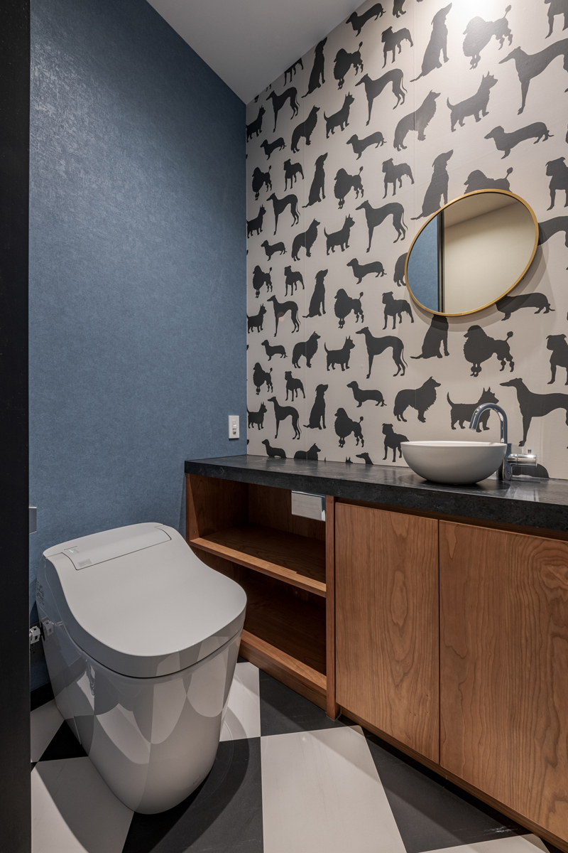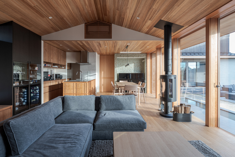 △ダイニングは暖炉と大型テレビ付きで愛犬とも過ごせます。